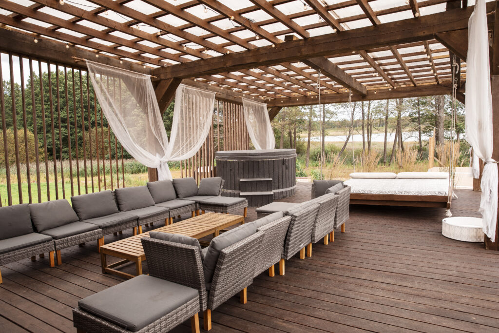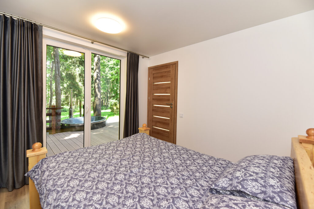 Erdvioje terasoje yra lauko baldai ir kubilas, o taip pat pirtis, leidžianti mėgautis pilnaverčiu poilsiu gamtoje netoli Vilniaus.