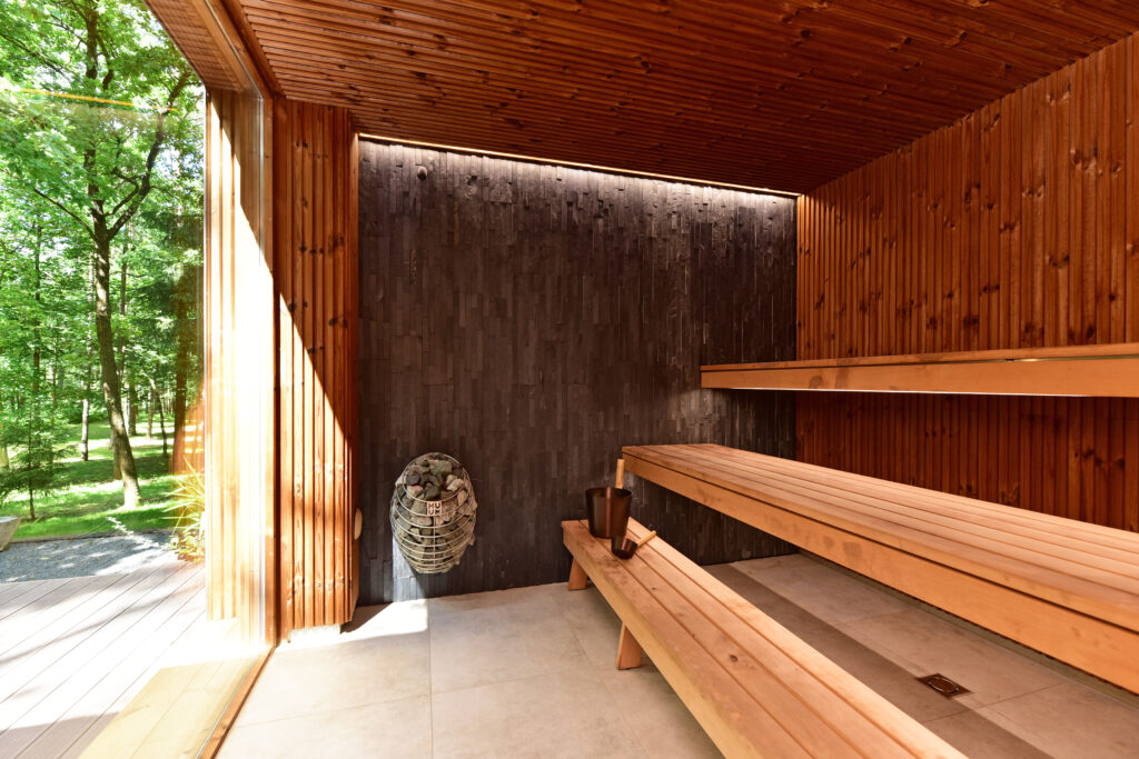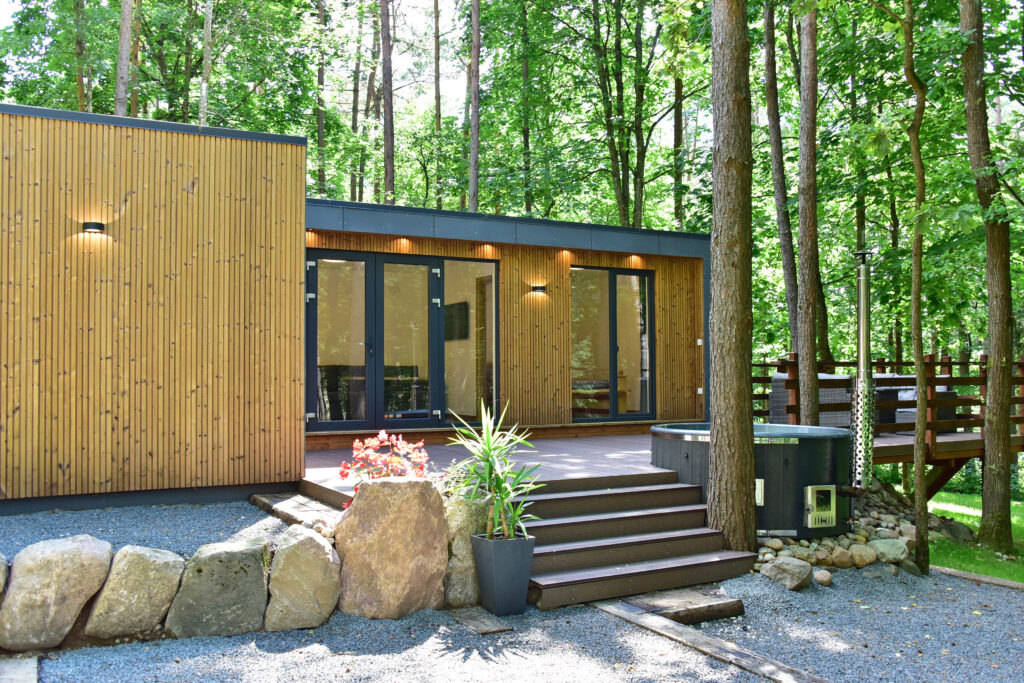 Forest relax namelis stovi miškelyje, o dalis sienų – vitrininiai langai, leidžiantys mėgautis gamtos vaizdais net būnant viduje. Šis namelis išsiskiria tuo, kad vitrininiai langai yra ir privačioje pirtyje.