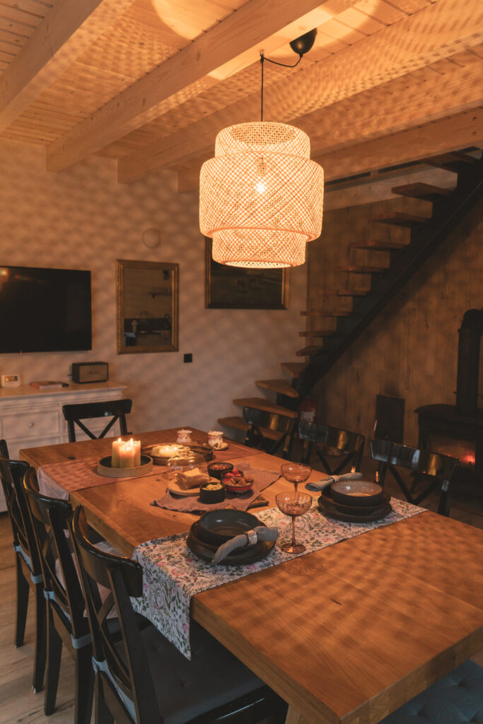 - virtuvė su visa reikalinga buitine technika, indais ir įrankiais gaminimui bei dideliu valgomojo stalu;