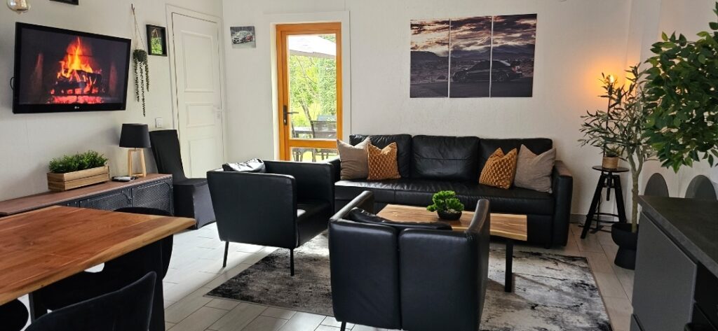 Namelis Euforija yra šešiavietis – jame yra du atskiri miegamieji kambariai su dvigulėmis lovomis, o papildoma dvigulė sofa-lova yra bendroje svetainėje. Šiame namelyje 2025-ųjų pabaigoje lankėsi visa mūsų komanda, o įspūdžiais pasidalinome šiame tinklaraščio įraše.