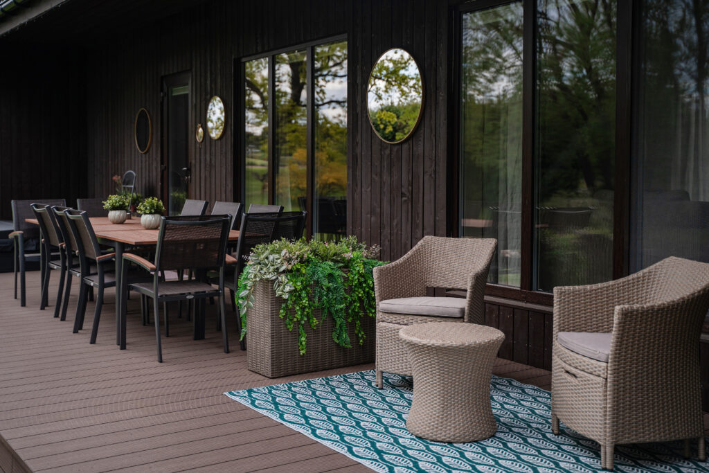 - terasoje su šildytuvais, lauko baldais, ugniakuru ir anglimis kūrenamu griliu;