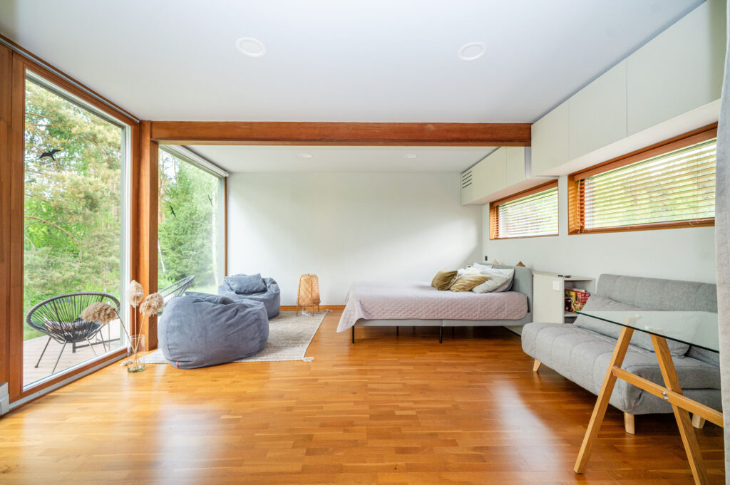 Namelio viduje įrengti vitrininiai langai, todėl vos prabudę ar išsivirę pirmąjį kavos puodelį galėsite mėgautis bundančios ryto gamtos vaizdais.