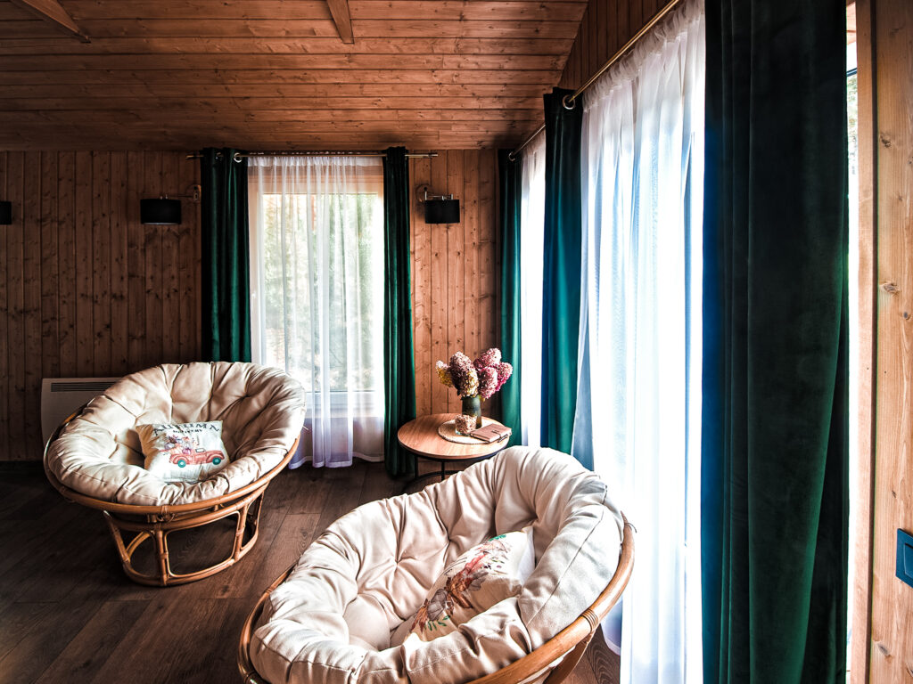 Šios sodybos pavadinimas puikiai apibūdina, koks poilsis čia laukia svečių – miško terapija. Net jeigu viešnagės metu oras nebus draugiškas, gamtos ramybę vis tiek pajausite, nes abiejų namelių langai yra vitrininiai. Galėsite įsitaisyti lovoje su knyga, mėgiamos arbatos puodeliu ar tiesgiog šnekučiuotis stebint ošiantį mišką.