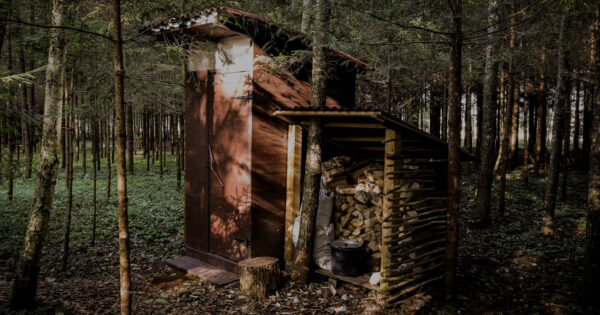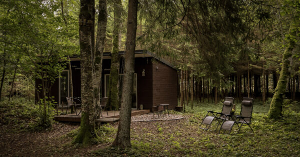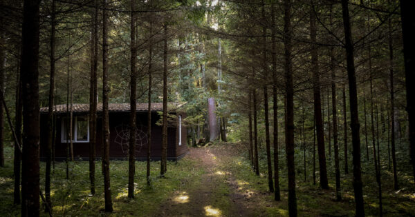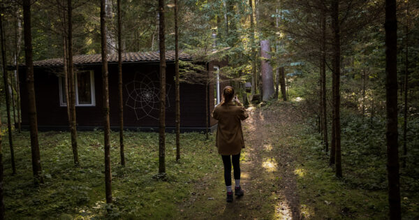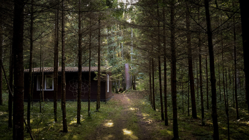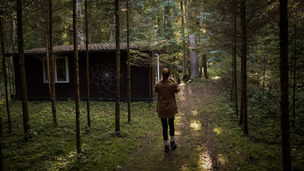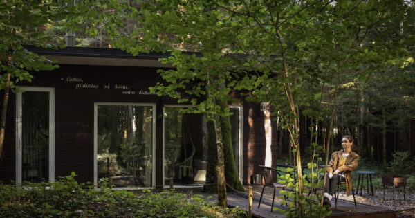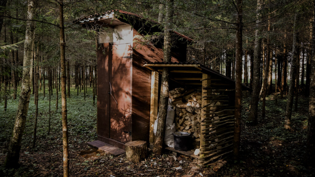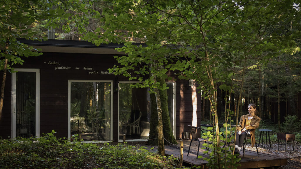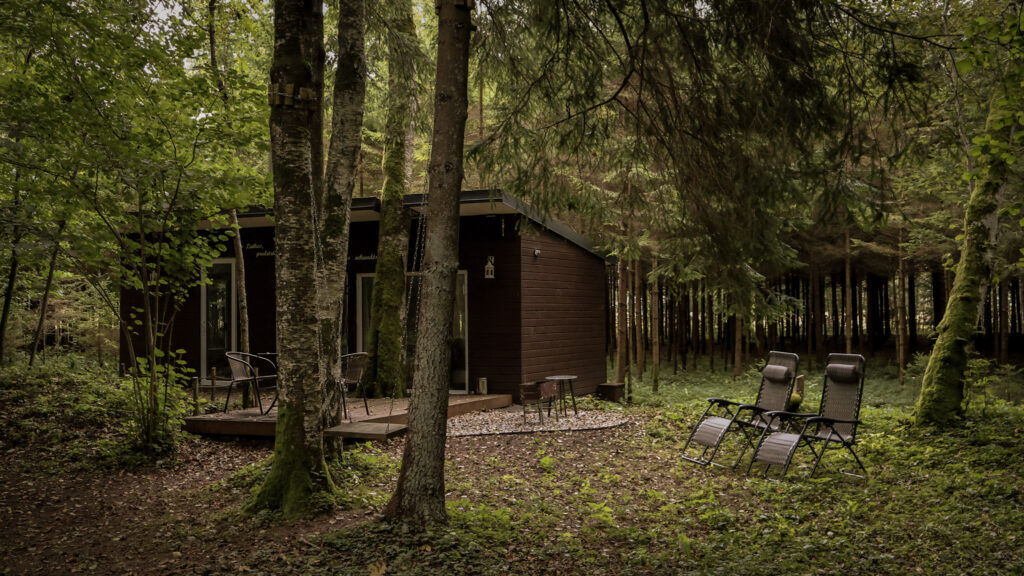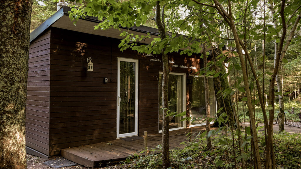 Off-grid namelis su pirtimi ramiam privačiam poilsiui miško apsuptyje.