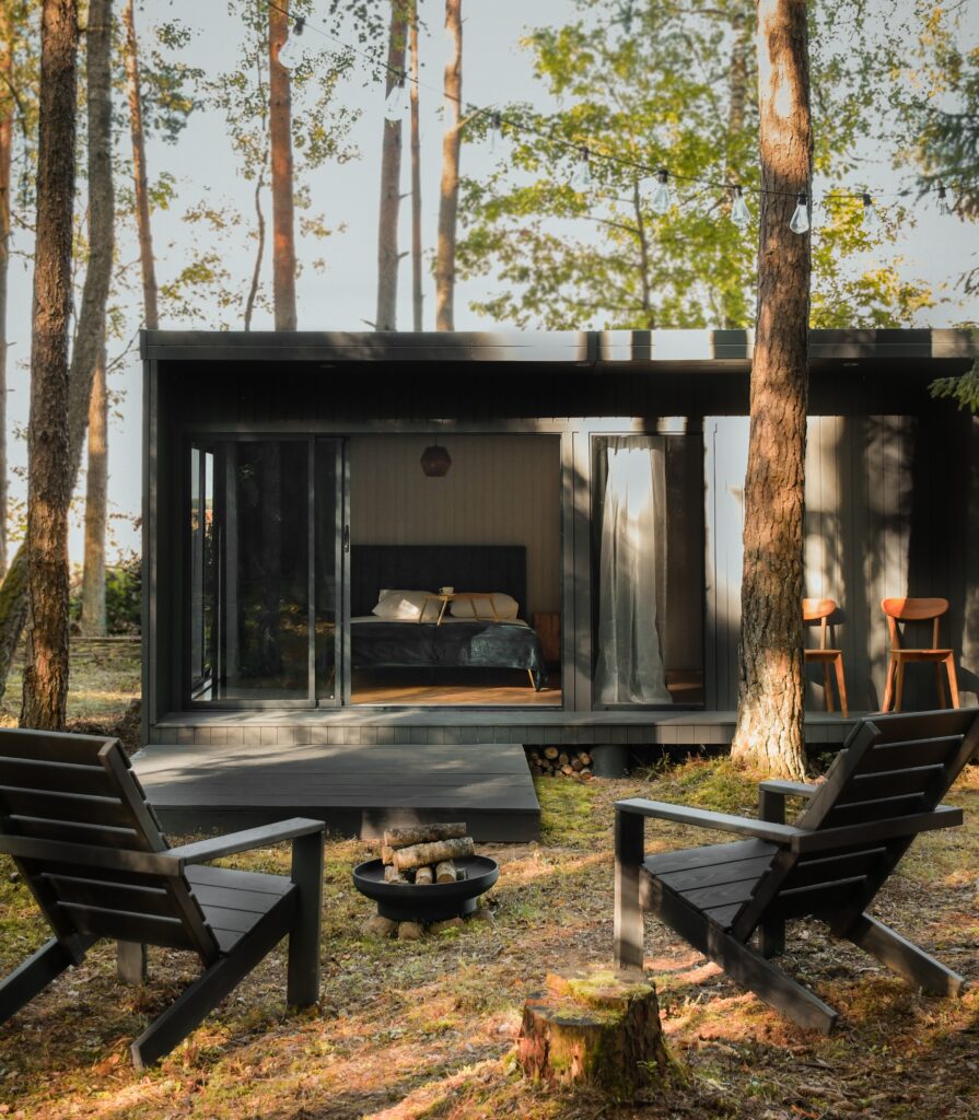 Namelis po pušim – ideali vieta lėtam poilsiui. Neskubėdami mėgaukitės kavos puodeliu terasoje arba patogiai įsitaisykite ant gultų šalia namelio ir žiūrėkite į dangų pro pušų kamienus.