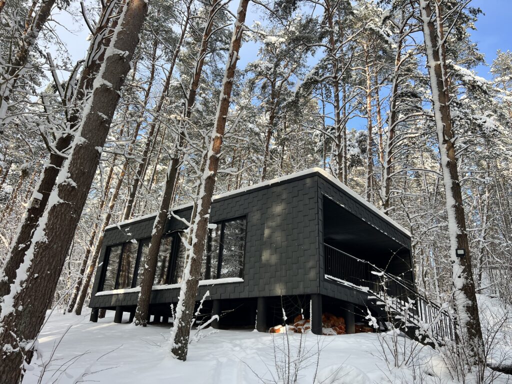 Vienas iš trijų keturviečių namelių pušų apsuptyje su kubilu poros ar šeimos poilsiui gamtoje.