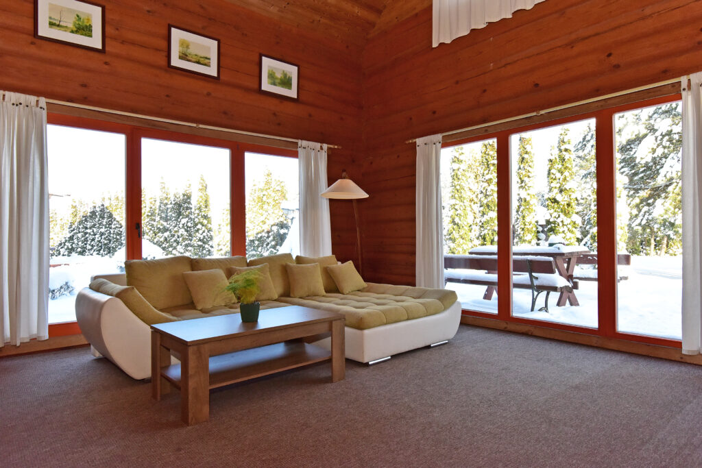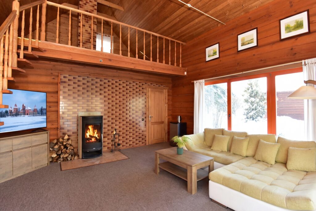 Rąstinis namelis dviems įrengtas taip, kad jame būtų gera ilsėtis tiek vasarą, tiek žiemą. Pirmajame aukšte jūsų laukia svetainė su sofa, kur vakarus galima leisti prie spragsinčios krosnelės-židinuko, žiūrint mėgstamą filmą ar tiesiog garsiai svajojant žvelgiant pro vitrininius langus. Antrajame aukšte įrengta patogi dvigulė lova ramiam miegui ir lėtiems rytams. Vonios kambaryje rasite sūkurinę vonią, rankšluosčius ir higienos reikmenis. Namelyje nėra virtuvės – tai sąmoningas sprendimas, leidžiantis visiškai pailsėti nuo buities ir kasdienybės. Jei prireiktų indų ar taurių, juos nemokamai suteiks restoranas, o norintiems gaminti lauke, už papildomą mokestį galima išsinuomoti šašlykinę su malkomis, iešmais, grotelėmis ir visais reikalingais indais.