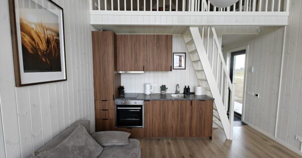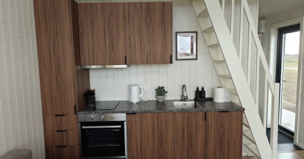 Tiny house namelis yra įrengtas su visais patogumais, kad ilsėtumėtės be rūpesčių. Jis yra skirtas poilsiui dviems – keturiems asmenims, tad nesvarbu, ar atvyksite dviese, ar su šeima, o gal pora draugų, visi tilspite. Viduje yra dvi miegamos erdvės – dvigulė sofa-lova namelio svetainėje ir dvigulė lova miegamajame-antresolėje. Gaminimui įrengta ir virtuvėlė, kurioje rasite reikiamus indus bei įrankius, taip pat kavos aparatą, kavos, arbatos. Vonios kambaryje paruošti rankšluosčiai, reikėtų pasirūpinti savo higienos reikmenimis. Namelyje apsistoti galite visus metus.
